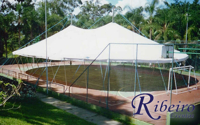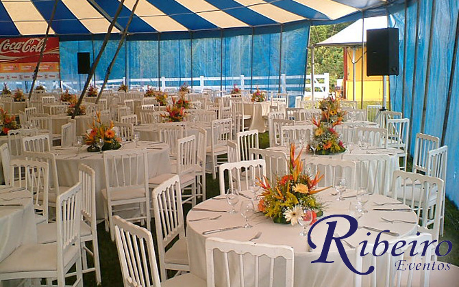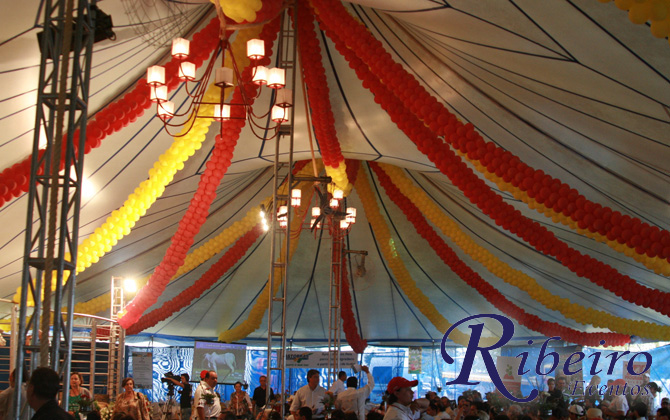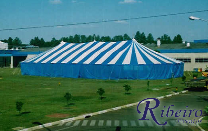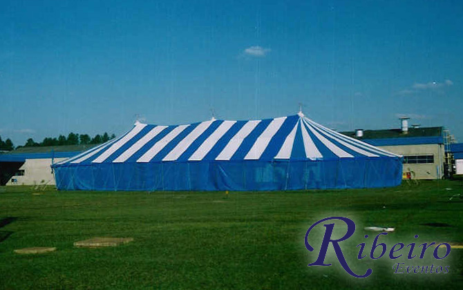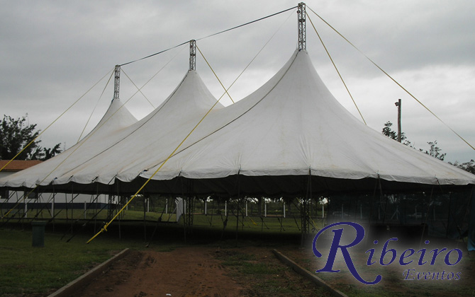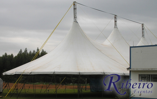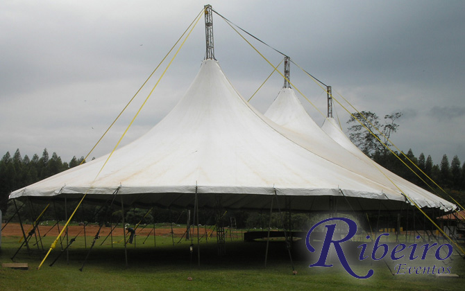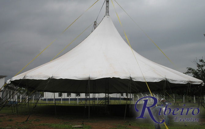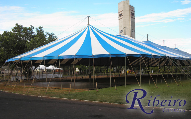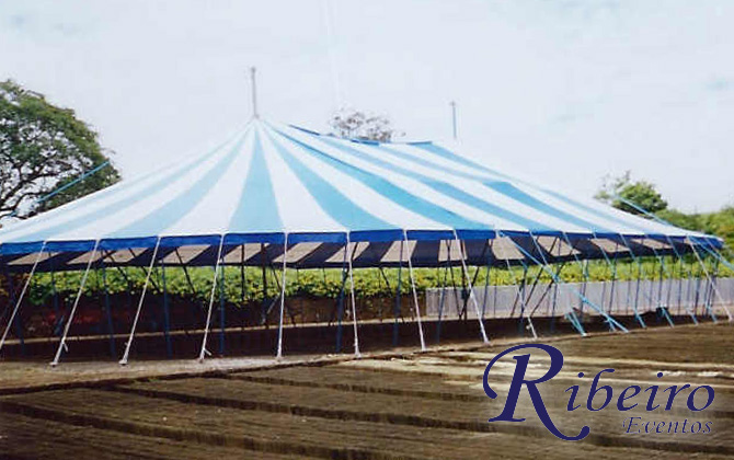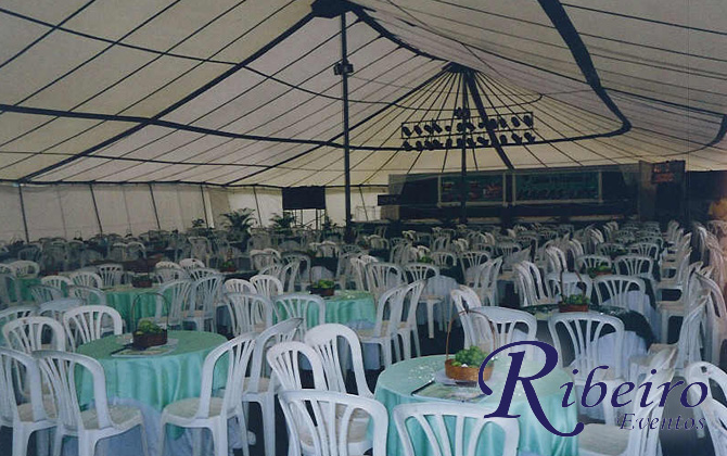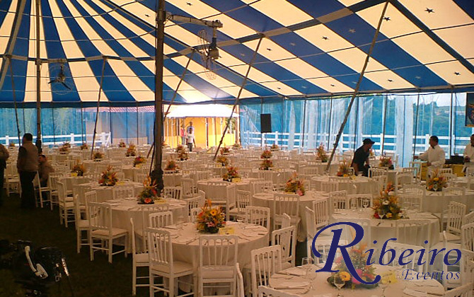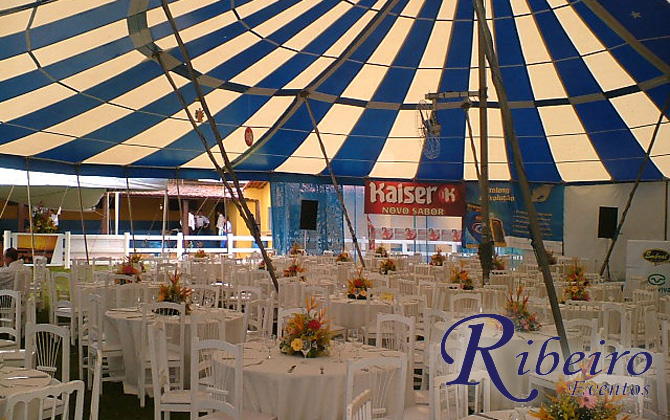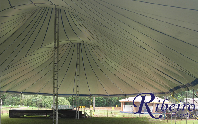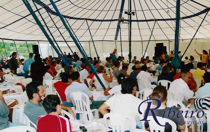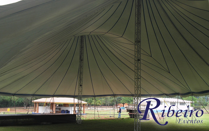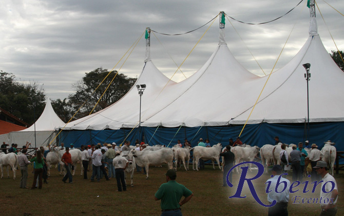 Estrutura para leilão rural: Cobertura tipo circo, palco, cadeiras e mesas.