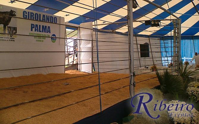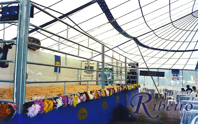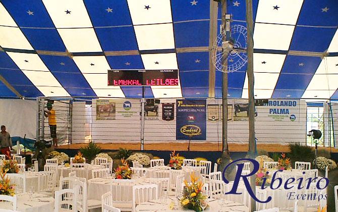 Estrutura para leilão rural: Cobertura tipo circo, palco, cadeiras e mesas.